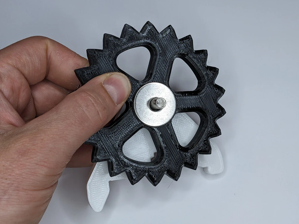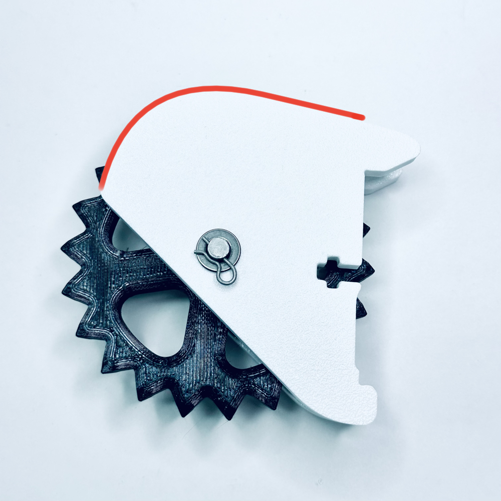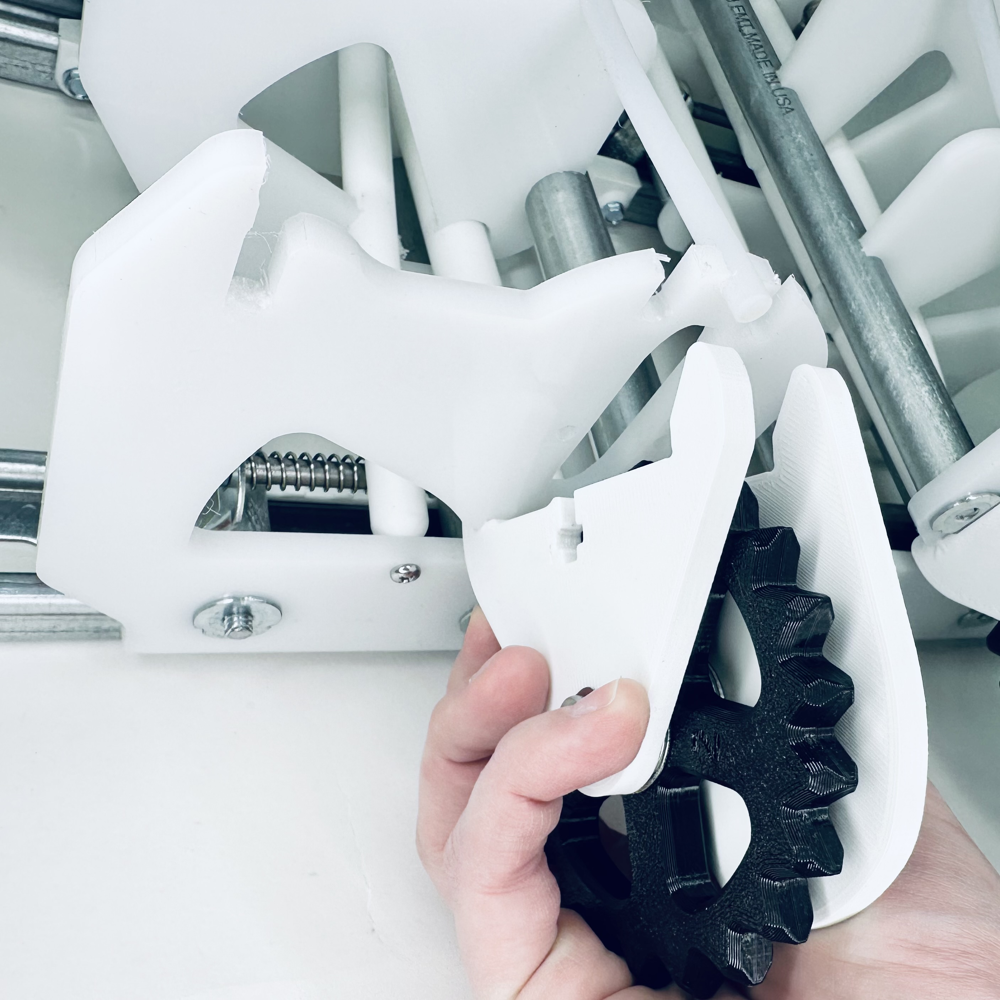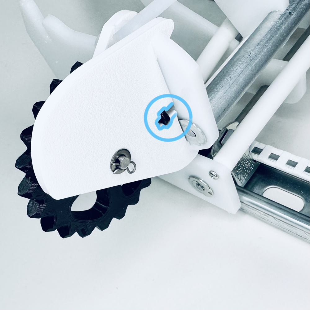 - Take note of the large rounded side of the sprocket assembly. This will be on the inside and is intended to help guide the wire mesh into the machine.