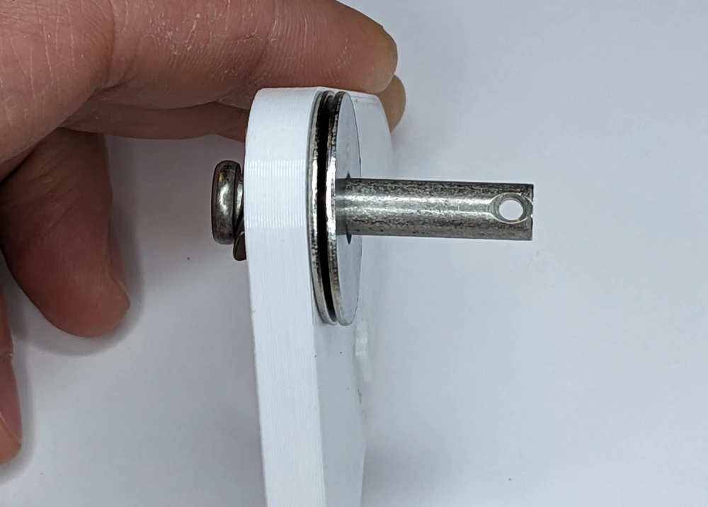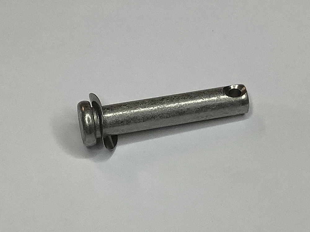 - Grip the assembly and squeeze the parts together so that the spring washer is compressed, and the end of the clevis pin sticks out.