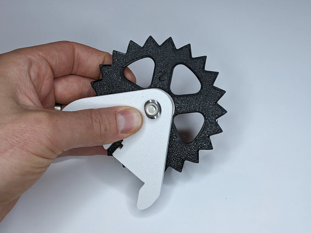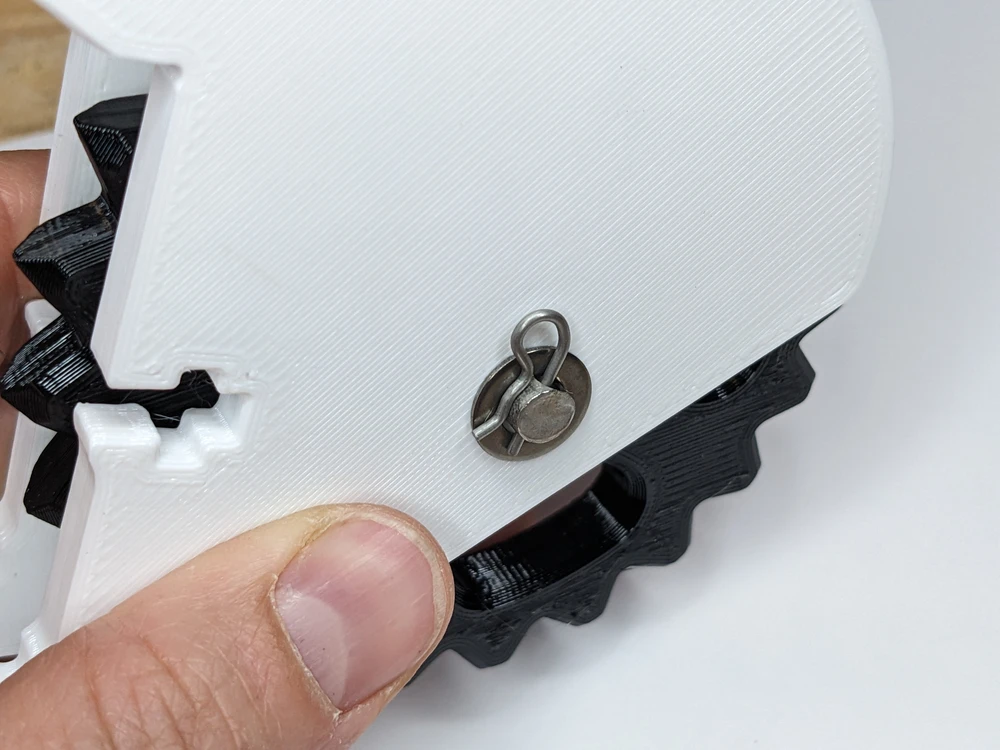- Stick the clevis pin into the outer (smaller) sprocket bracket. If you’re assembling Side B, push it in from the opposite side as shown in the photo.